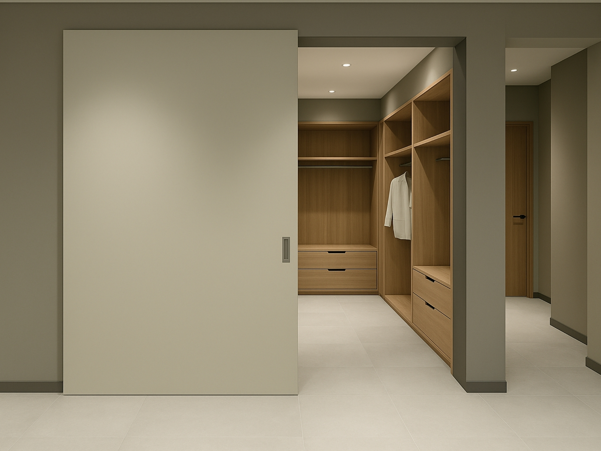 Invisible Door Sürgü Kapı Sistemi, kapının açık ya da kapalıyken duvar yüzeyiyle bütünleşmesini sağlayan yenilikçi bir sürgü kapı sistemidir. Raylar ve tüm taşıyıcı mekanizmalar tamamen gizli yapıdadır; sistem yalnızca kapı panelini görünür kılarak mimaride sade ve kesintisiz bir etki yaratır.